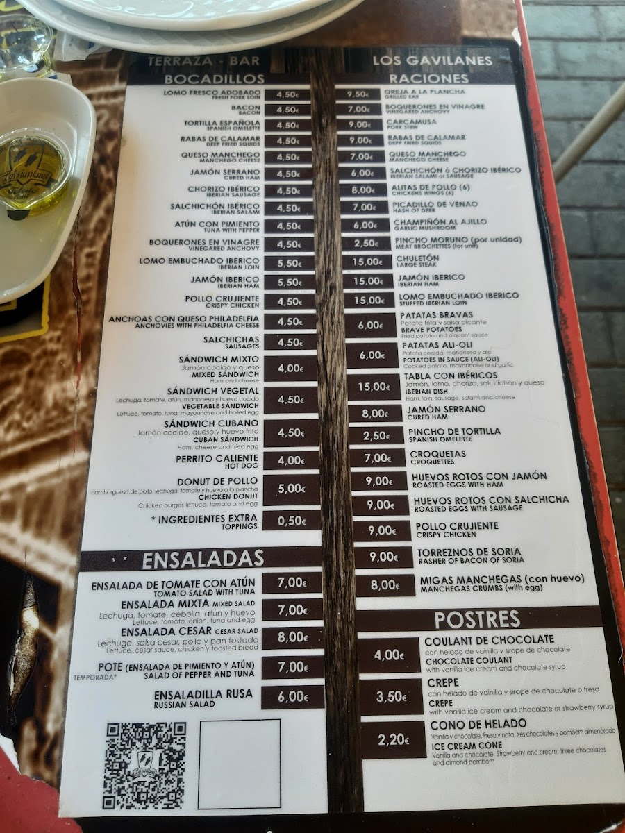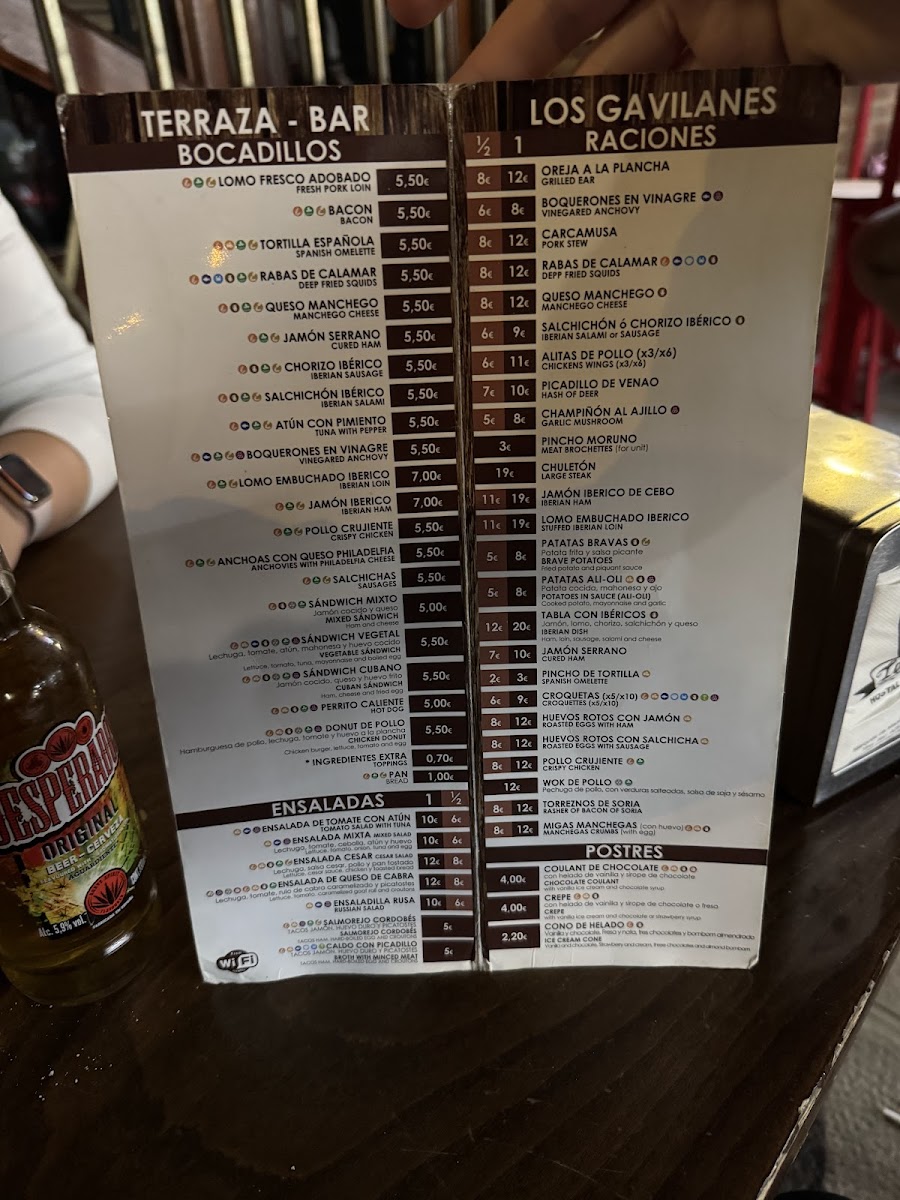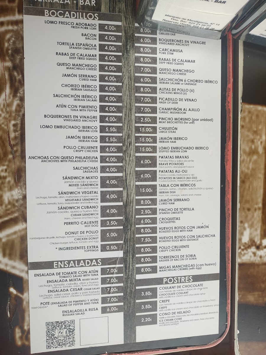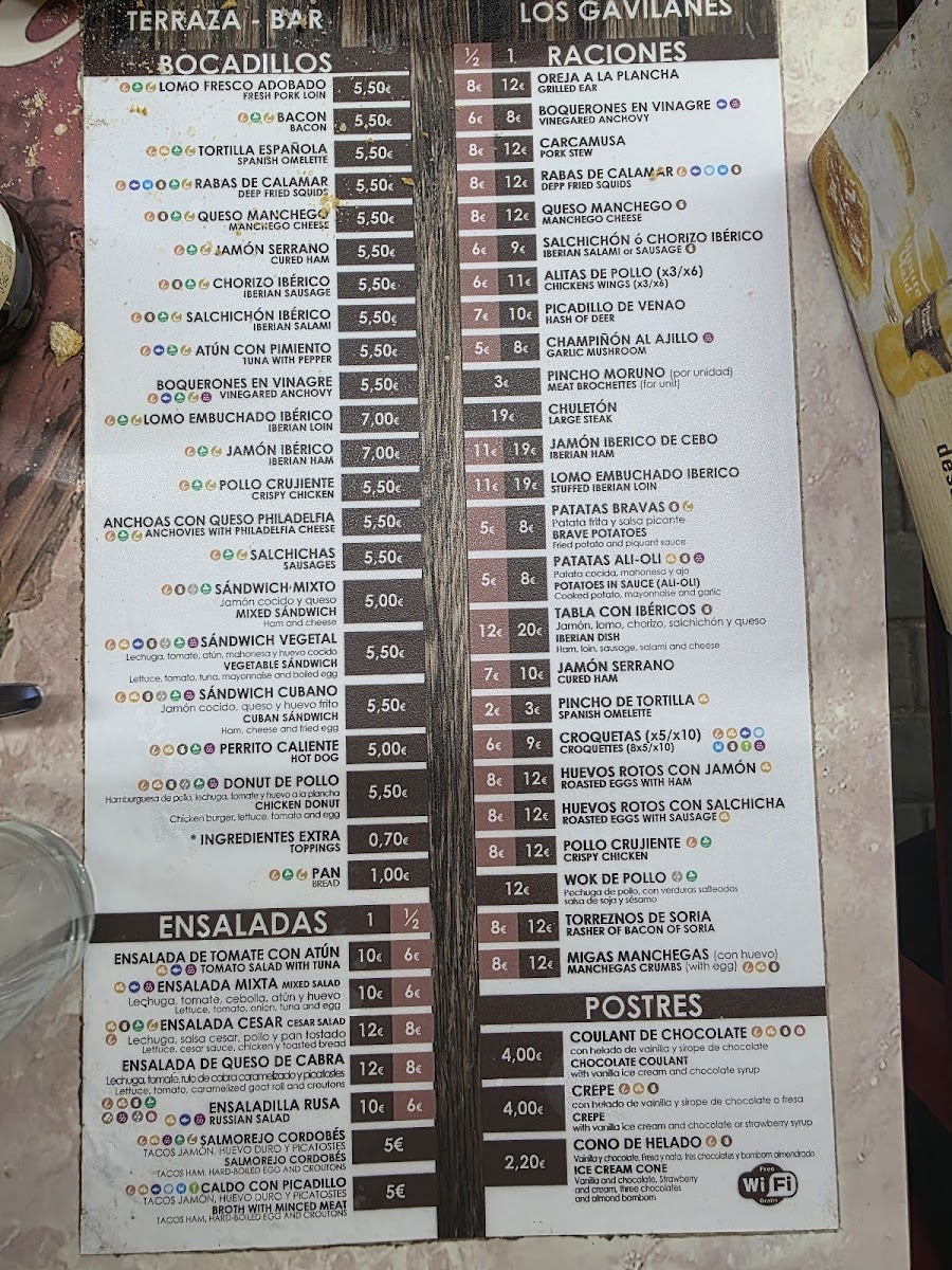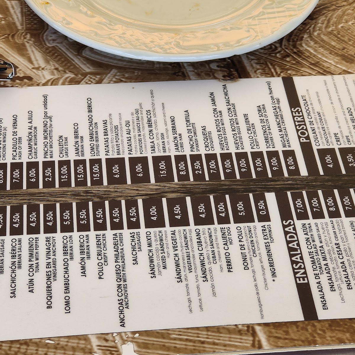 Overall, the menu allows for quick orders or more relaxed meals combining a variety of small plates and drinks typical of a Spanish tapas bar setting.