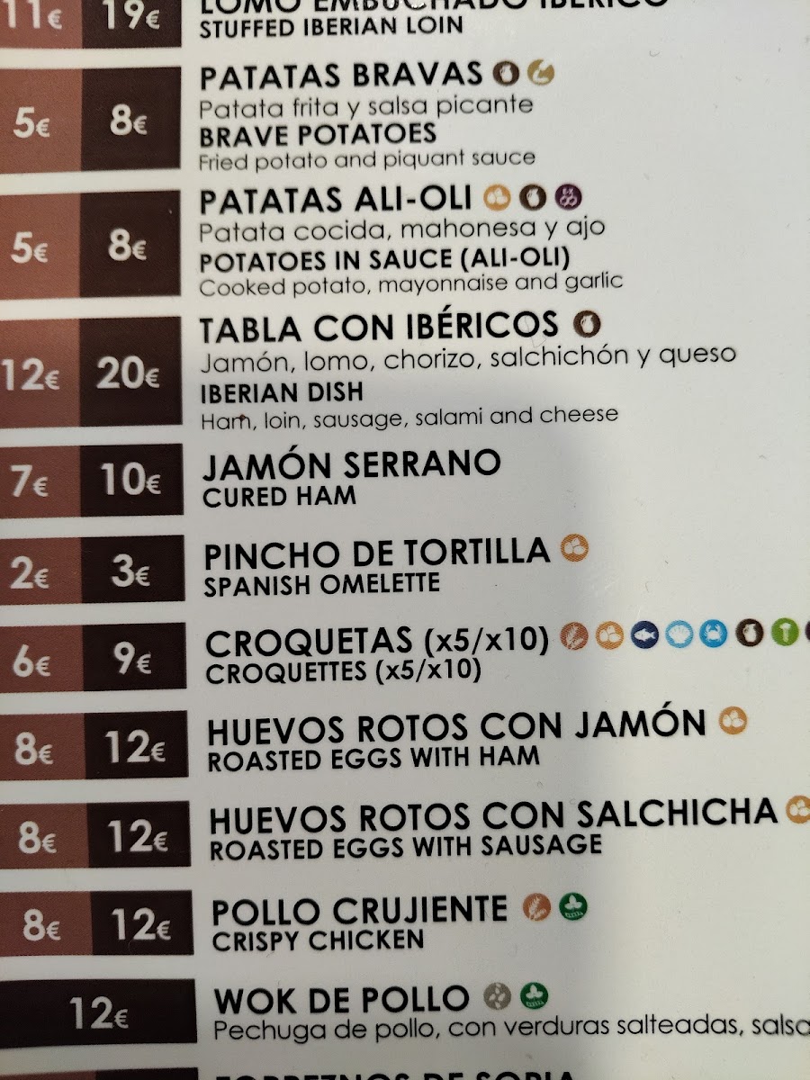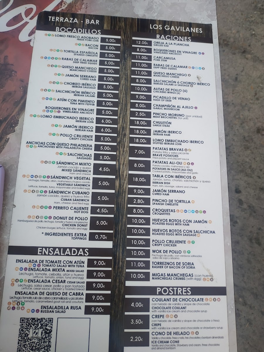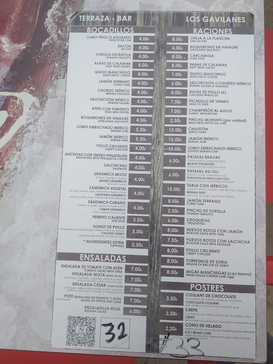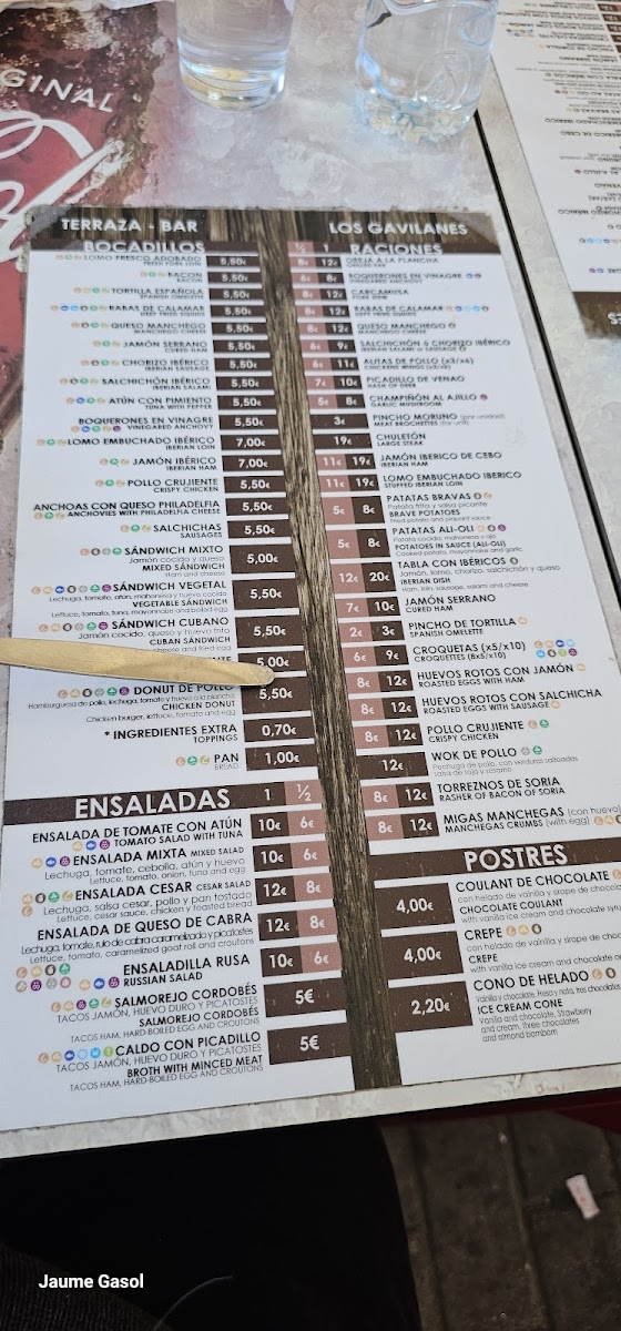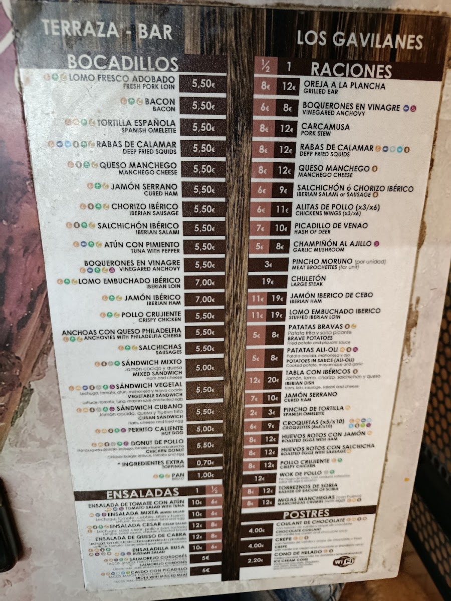 Overall, the menu allows for quick orders or more relaxed meals combining a variety of small plates and drinks typical of a Spanish tapas bar setting.